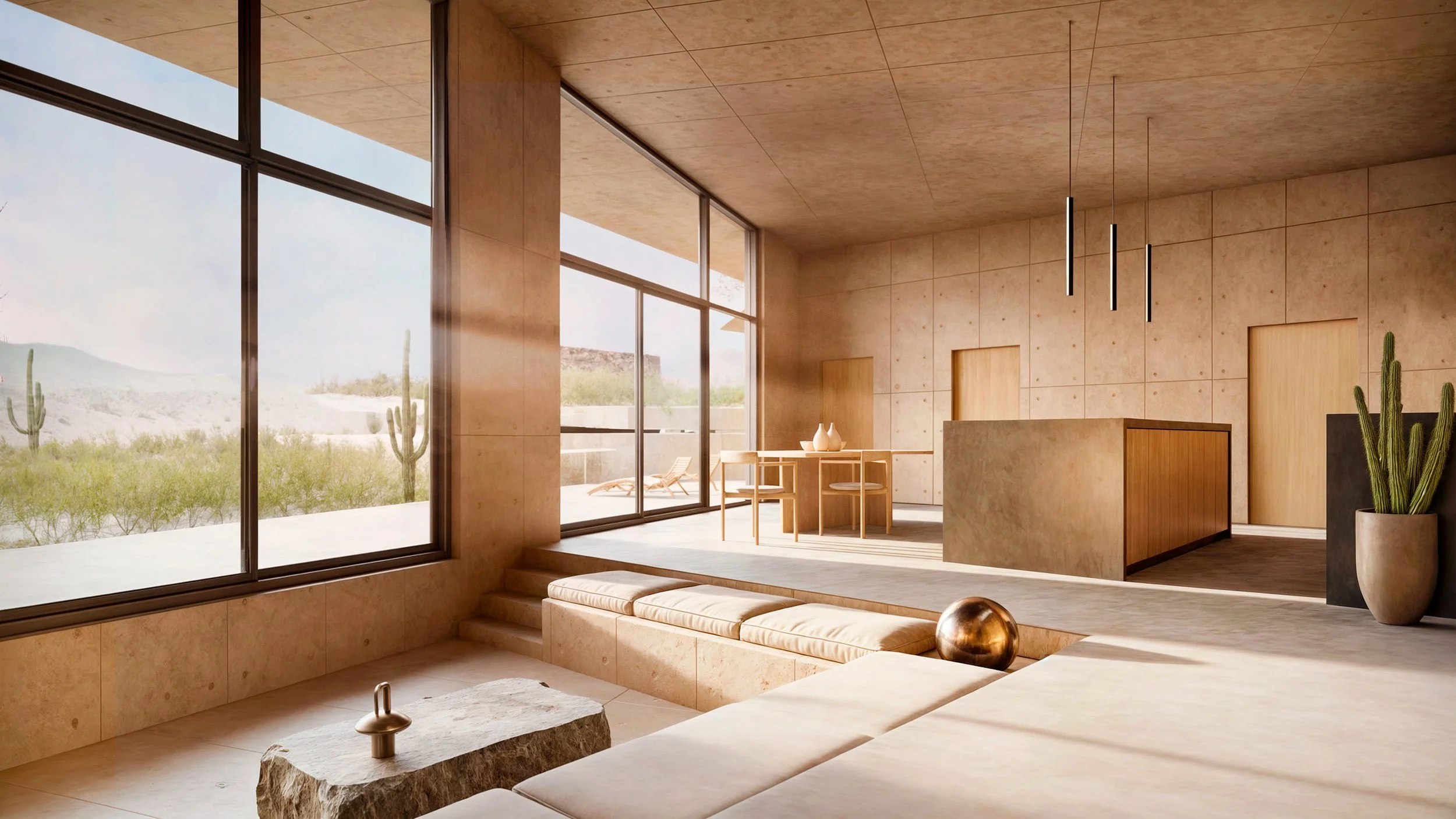 Terra Sabia stretches across the land like a bird in flight, casting its presence over the terrain. The structure unfolds in two wings connected by a subterranean courtyard. The east wing is partially embedded in the terrain, opening to views of the arroyo and the Sea of Cortez, with deep overhangs protecting from the sun, naturally cooled by the earth’s thermal mass.